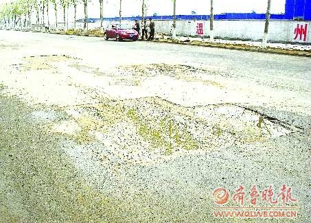 在兴海路西段,有大大小小的浅坑将近十个,这些坑多为整齐的长方形,每隔几百米就有一个,最大的约30平方米,几乎占据了马路宽度的1/3,给行人和车辆带来很大不便。 见习记者 张萍 摄