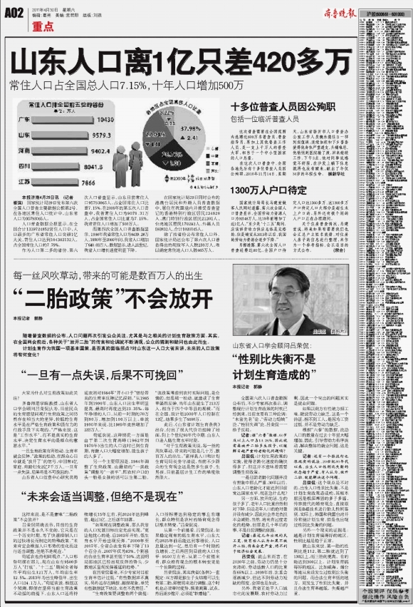 山东人口离1亿只差420多万