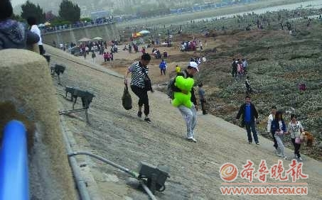 堤坝的东边是大片的礁石。记者看到,一位中年游客为拍照片,几经周折爬到了一米多高的礁石上。在鲁迅公园,记者也看到了相同的场面,海边大片的礁石上,每隔3米就有游客在照相。