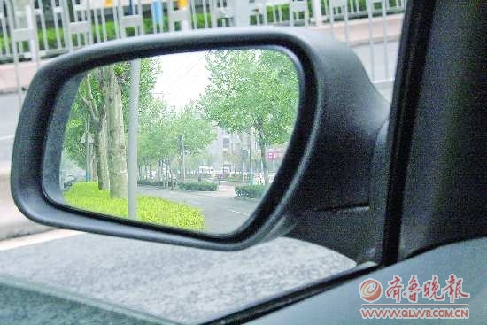车头进入并道口,记者发现左侧后视镜显示的是绿化带西侧车道上的情况,必须将头探出车窗才看到后方内道上的情况。