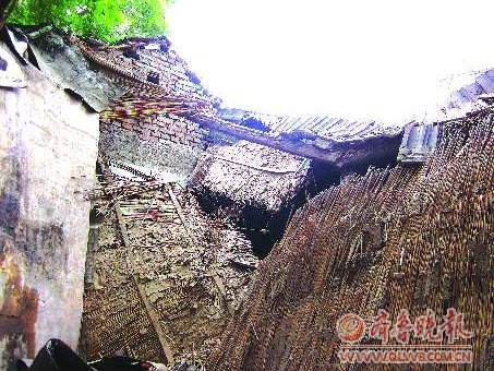 店员小庄说,事情发生在9点半左右,忽然大量灰尘从房顶落下,随后房顶装饰用的薄板也开始从西侧脱落,客户迅速把她拉出店外,才没被砸伤。短短几分钟内,天花板,屋梁、瓦片也全部坍塌下来。