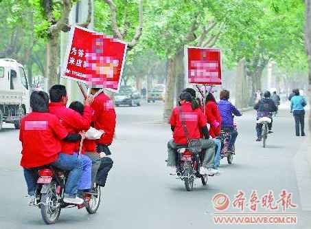 一辆电动自行车上坐着五个人,一个人举着宣传牌,还有一个人坐在车筐里。9日,在济宁城区红星路上,两辆缓速行驶的电动自行车引起很多市民的注意。原来,这两辆电动车是某品牌的促销宣传车,虽然载着5个人还行驶自如。