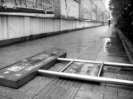 8日,记者采访发现,在胜利街与虞河路交叉口,一块道路指示牌被恶意推倒。本是为行人提供行路方便的指示牌,却横躺在人行道上,过往行人纷纷绕道而行。