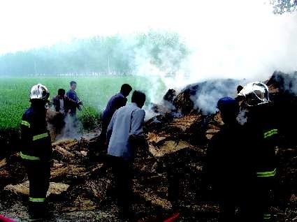 4时12分,消防官兵到达火灾现场。现场一座民房后面堆积的一大片草帘堆起火,火势较大,而且有大量明火和浓烟冒出,危及民房安全。而草帘堆北面是一片麦田,火势正在向四周蔓延,现场有很多群众围观。