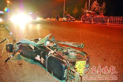 5月11日晚上7时许,在迎宾路与公园路交会处,一辆由东往西行驶的出租车与一辆摩托车发生交通事故。出租车撞倒了路中间十多米的护栏,摩托车躺倒在离出租车20多米的位置。摩托车司机被送往医院。