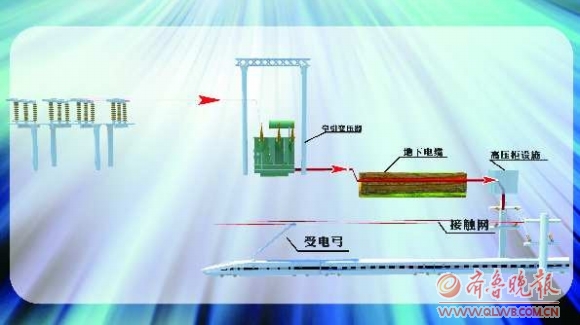 山东电力集团公司发展策划部副主任曹增功介绍说,这一系统主要是指牵引变电站和接触网两大部分。牵引变电站简称牵引站,一般设在铁道附近,它的主要任务是将电力系统送来的三相高压电变换成适合电力机车使用的单相交流电,然后送到铁路上空的接触网上。