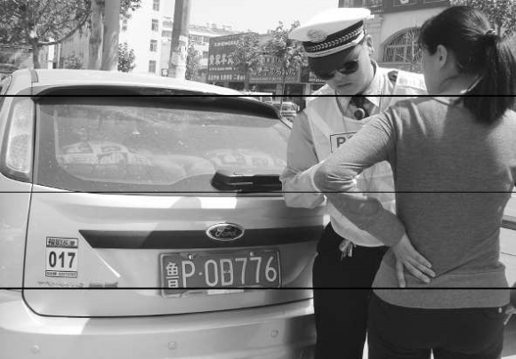 14日上午10时许,在城区振兴路和卫育路口,一辆自东向西行驶的小轿车在交警的引领下停到路边,该车后车牌明显有改动痕迹。“原车牌是鲁P0D776,现在改成了鲁P0B776。”交警说,驾驶员是用胶纸私自粘贴涂改的。而车上一名女士对此表示“并不是她改的,她也不知道。”