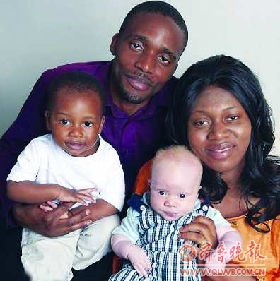 据了解,该产妇的家族曾经出现过这种情况,6代人以前,其家族曾有妇女诞下金发婴儿。图为黑人夫妇和他们的“黑”“白”孩子。 (钟信)