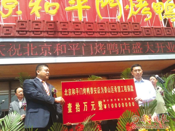 15日,位于东岳大街的北京和平门烤鸭泰安店隆重开业,并向泰山区希望工程捐款10万元。