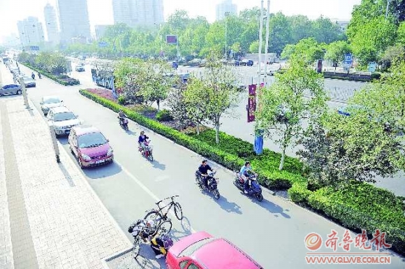 5月16日,在济南经十路的副道上,从行人赶路的倒影可以看出阳光的炽烈,然而旁边的树木却形不成绿荫。 本报记者 王媛 摄C04?主打