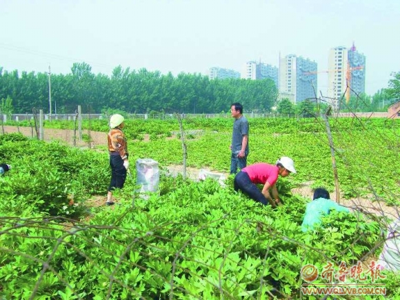 ▲花农在何家花园内为牡丹田锄草。      景佳 摄
