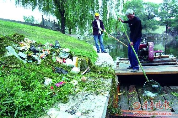 “河面上经常漂浮着一些生活垃圾,不但看起来让人添堵,时间一长河水也会变臭。”环城公园管理办公室主任陈黎明说,目前每天都有十几名工作人员在护城河上打捞垃圾,有的在船上打捞,有的拿着竹竿网在河流主要部位、死角处打捞。