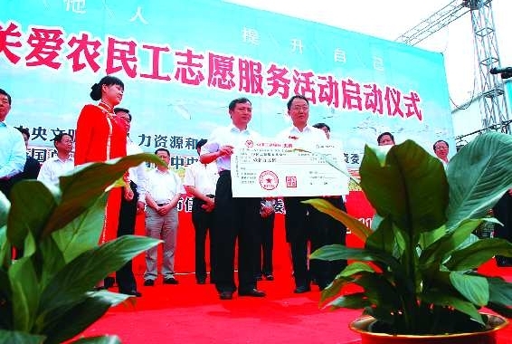 26日上午,东营市关爱农民工志愿服务活动启动仪式在东城辉煌广场举行,12家企业为此次农民工志愿服务活动捐款总计120万元。 (详见C02 综合)