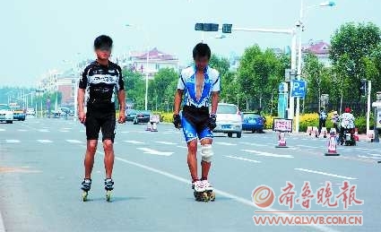 近日,在滨州市区黄河七路上,两位轮滑玩家正在马路上边滑边聊,几乎占去了一个车道,让人为他们的安全捏一把汗。如此玩轮滑看起来很酷,但却非常危险。