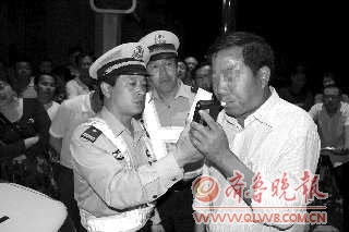 5月31日夜间,乳山市公安局交警大队开展了突击夜查酒驾行动,在3个多小时的时间里,查处酒后驾驶交通违法行为5起,其中涉嫌醉酒驾驶3起,3名醉酒司机均被刑事拘留。图为,一位司机接受民警的酒精呼气测试。