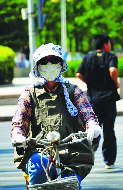 6月1日,毒辣的阳光让行人酷热难耐,一市民“全副武装”行在临沂市区沂蒙路上。