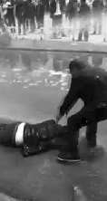 伴随着冲突,一排高压水龙头射出的水柱,顺着路面激射而来,路上一部分人被冲倒在地。网贴的视频中,就有一个人被激射的水柱冲倒后,连滚带爬到了路边才站起来。