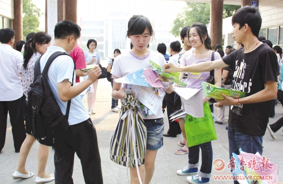 7日,2011年全国高考的第一天,记者在泰安市各高考考点看到,每位家长的手中基本上都拿着七八份宣传单页,这里面既有省内外民办高校、技术院校的,也有各类复读培训机构和留学机构。