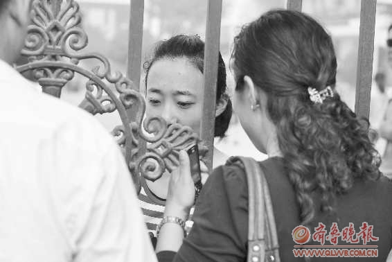 6月7日上午8时许,在枣庄三中东校考点,一位考生的家长在孩子进入考场后又把孩子叫回来,隔着校门给考生做临考前的最后叮咛,嘱咐孩子别紧张,从容应考。
