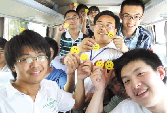 考场,在车上和老师一起展示他们的“笑脸”。 本报表记者 邹俊美 摄