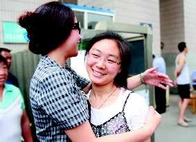 距考试结束还有5分钟,考生家长便向校门口拥挤。11点5分,陆续有考生走出校门。“这里这里,我们再这里。”任女士站在台阶上挥手招呼着女儿。该女生跑上台阶,站在一边的同事把鲜花送上,任女士则深深给女儿一个拥抱。