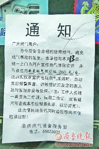 据了解,出现这一情况的区域位于省城东北部南全福附近,共涉及三个小区。13日,济南港华接到多位市民反映,有人自称是“港燃燃气设备服务部”的,到用户家中进行燃气安全检查,要求客户统一安装价格为260元的“燃气探测仪”,安装后可“防泄漏、防爆炸”,不少市民感觉不对劲便拨打了济南港华热线询问情况。