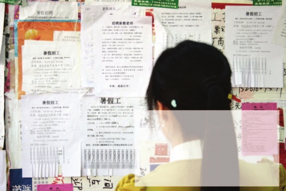 在潍坊学院校园里的广告栏上,数量最多的占的面积最大的就是暑期招聘广告,有招聘家教老师的、有宣传单发放员、包装工等,招聘的工作种类多是一些简单工作,每月的基本工资都在1500元左右,一些对学生专业要求高的可以达到每月2500元。招聘广告多是企业自己粘贴的,而且薪水比往年涨了不少。