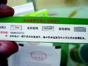 在刮奖区的下方,是一个手机兑奖热线,并且还注明“销售地点一概不承担兑奖责任,请中奖者直接与本公司兑奖处取得联系。在这张卡片的另一面,标注着一等奖是一辆价值28万元的轿车,二等奖则是15.8万元现金支票。此后,还有三四五等奖及纪念奖。