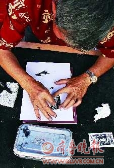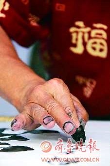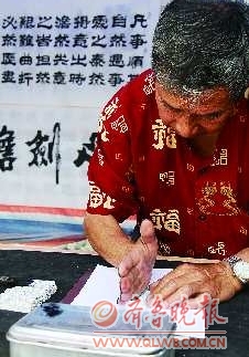 8日上午,记者在观湖城广场见到了这位不拿任何书画工具,只用手指、拳、掌来完成大作的七旬老人。他叫唐世友,贵州人,昵称很多,如“奇才”、“怪杰”、“东方一绝”……