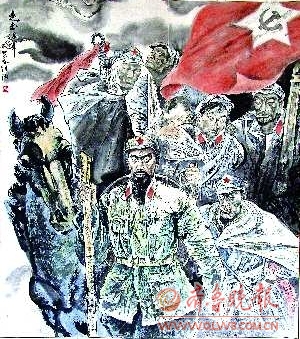记者了解到,这幅画名叫做《走出沼泽》,展示了长征时期的艰难,周恩来带着战士们最终突破重围,走出沼泽地,看见了胜利的曙光。画面上在灰色的背景下,飘扬的红旗尤显鲜艳。