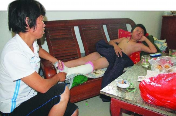 因为午休时不遵守学校的纪律,在苍山县志成学校读五年级的12岁男童宋诗文的左腿被老师打成骨折。图为左腿打着石膏的宋诗文躺在家里养伤。 本报记者 张斌 王晓 摄