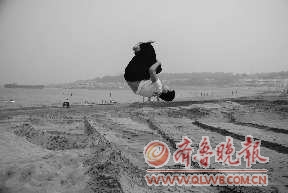 23日,在第三海水浴场,跑酷爱好者小马正在沙堆上练习空翻。跑酷诞生于上世纪80年代的法国,一项爱好者把整个城市当作一个训练场,一切围墙、屋顶都可以攀爬、穿越,非常具有观赏性的极限运动。