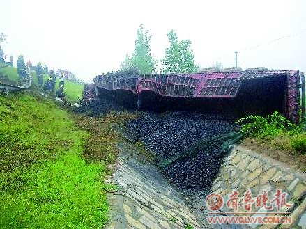 23日凌晨4时23分,青银高速夏津段济南方向433公里处,一辆满载50吨煤的大货车行驶中突然发生了爆胎,整辆车侧翻到公路下的排水渠上,满载的煤块撒落一地,一名司机也被困车中。夏津县消防中队将受伤司机救出。 本报记者 曹宏源 本报通讯员 杜长青 张鑫 摄影报道