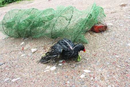 7日上午,在小埠东橡胶坝往南约5公里的北方植物大观园,滨河景区罗程管理所的工作人员在清理设在沂河湿地中的非法渔具时,在一段地笼里发现4只被困的野生水鸟,最底部的一只水鸟已经溺水死亡。其中,有一只水鸟被网具牢牢缠住脚,随水波沉浮,已经奄奄一息,最上面的两只在笼内拼命地挣扎,试图挣脱这夺命之网。执法人员用刀划破渔网,将三只水鸟取出。