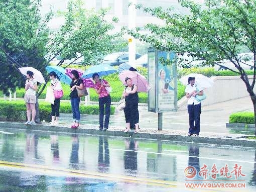 12日上午10点,天空中依然下着小雨,记者在烟台路与泰安路交会处北侧约500米处的公交站牌处看到,六七人正在雨中等车。由于没有遮雨亭,他们只能打着伞或淋着雨站在站牌的旁边。站牌旁边,有三个人竟挤到一把小伞下,这把小伞根本遮挡不住三个人的身躯,每个人身上都有一部分被雨水淋湿了。