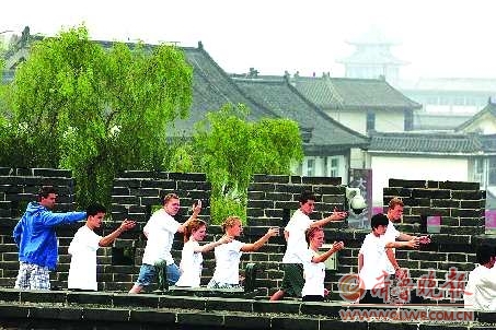 17日早上7点30分,23名奥地利学子登上曲阜明故城城墙,在城墙上跟老师(曲阜师范大学的王磊)翩翩起“武”———学习太极拳,由此开始在曲阜修学的第一课。“两脚开立,两臂前举……”23名学子在王磊的带领下学习太极拳招式,艾迪(译音)站在队伍中显得有些稚嫩,但是他练起太极拳全神贯注。
