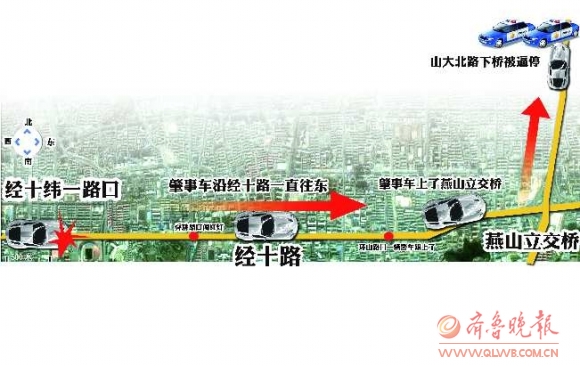 后来,奥迪车行至经十路环山路路口,看到路边的警车,又加速向东驶去。一辆警车随即上前,与刘警官乘坐的出租车一起在后面跟随。为了避免疯狂的奥迪车再酿事故,同时也为了避免伤及行人和其他车辆,交警并未上前拦截。