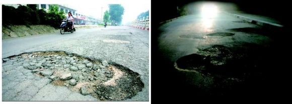 7月31日晚10点,记者来到潍州路铁路桥附近发现,路面上确如市民反映,布满了大大小小的坑,而且附近没有路灯,来往车辆都小心翼翼,减速慢行。对面车辆灯光直射下,很难看清道路状况,一不小心车辆就会进入坑中。记者大概数了一下,从潍州路佳乐家往南不足一百米的路段两侧,大大小小的坑居然达55个之多,其中大则直径两三米,小则二三十公分,由于正处路面中央,为行人安全带来不少隐患。