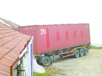 ▲集装箱货车的车头冲进民房,车身还在民房外。