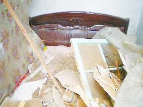 被撞房屋的房顶已经全部坍塌,天花板碎成一块块,悬在半空中。