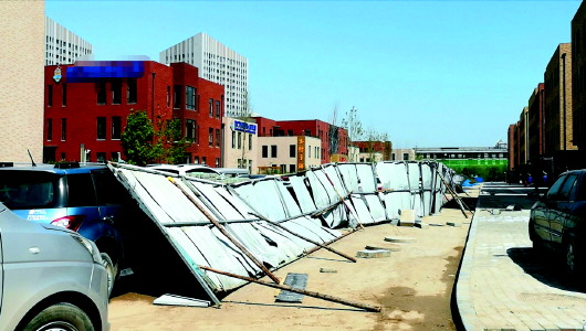 唐冶西路东侧一排围挡被大风吹倒。