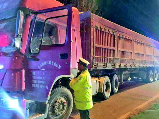 民警设点执勤检查过往车辆。 交警供图