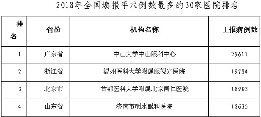 2018年全国填报手术例数最多的30家医院排名,明水眼科位居第四。