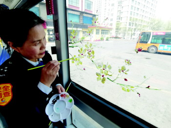 王慧在车窗上手绘花朵。
