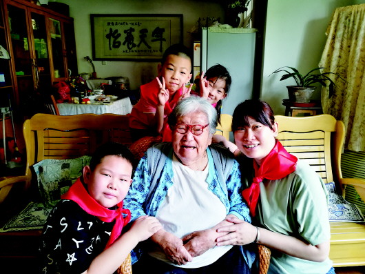 济南市景山小学的队员们寻访全国五老典型梁乃贞奶奶。