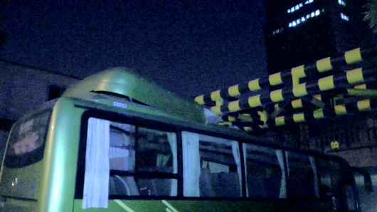 大巴撞上限高杆,被困两个多小时才脱身。视频截图