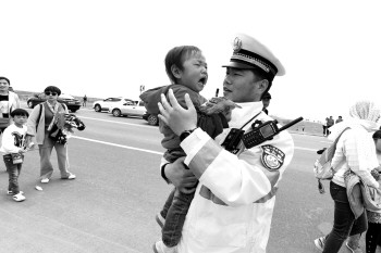 4月20日,第36届潍坊国际风筝会在滨海国际风筝放飞场如期举行。来自全国23家主流媒体摄影大伽及百名拍客也齐聚风筝会放飞场,定格空中舞动的色彩。当天,文汇报记者赵立荣抓拍到了一张交警怀抱哭闹幼童的照片。齐鲁晚报·齐鲁壹点记者认出,这名交警是奎文交警大队二中队民警刘阳。