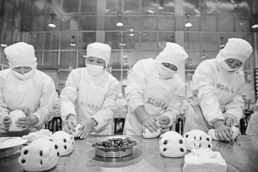 ◥颐尔佳食品员工现场制作开花大馒头。