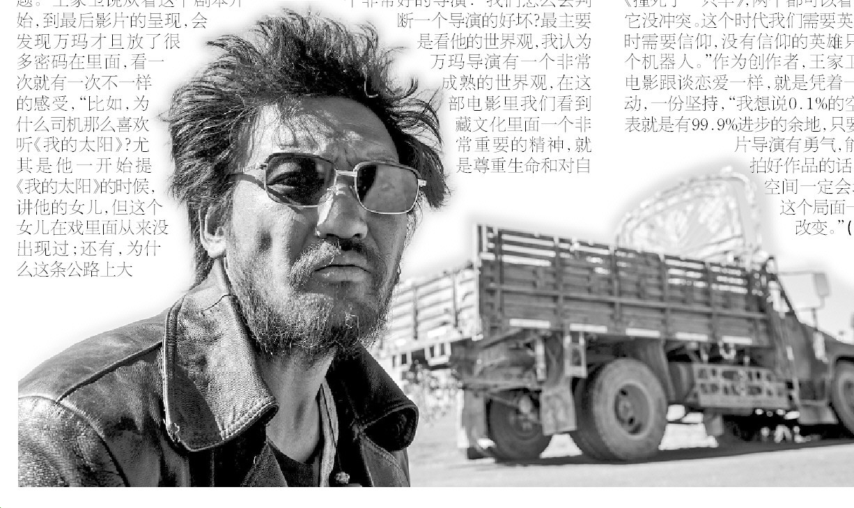 和万玛才旦导演的这次合作,王家卫说自己很荣幸,因为万玛才旦是个非常好的导演:“我们怎么去判断一个导演的好坏?最主要是看他的世界观,我认为万玛导演有一个非常成熟的世界观,在这部电影里我们看到藏文化里面一个非常重要的精神,就是尊重生命和对自然的敬畏。通过这个故事,我们可以检视自己。每个人都会焦虑,司机有他的焦虑,每个人都有一只羊,他们有他们的一只羊,我们有我们的一只羊,怎样去解脱,这是很有意思的。”