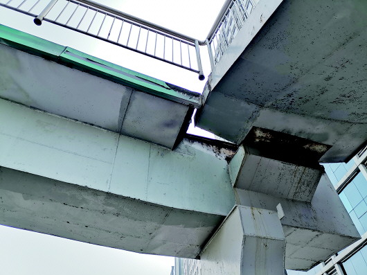 侯女士告诉记者,经过现场检测,发现南侧桥体主梁向东偏约30厘米,中间和北侧主梁也分别向东偏约10厘米,且桥体南侧东西两边的护栏焊接处有多处脱落,但主梁的中心还在桥墩的正上方,因此总体来看桥体主梁没有倾覆的风险。